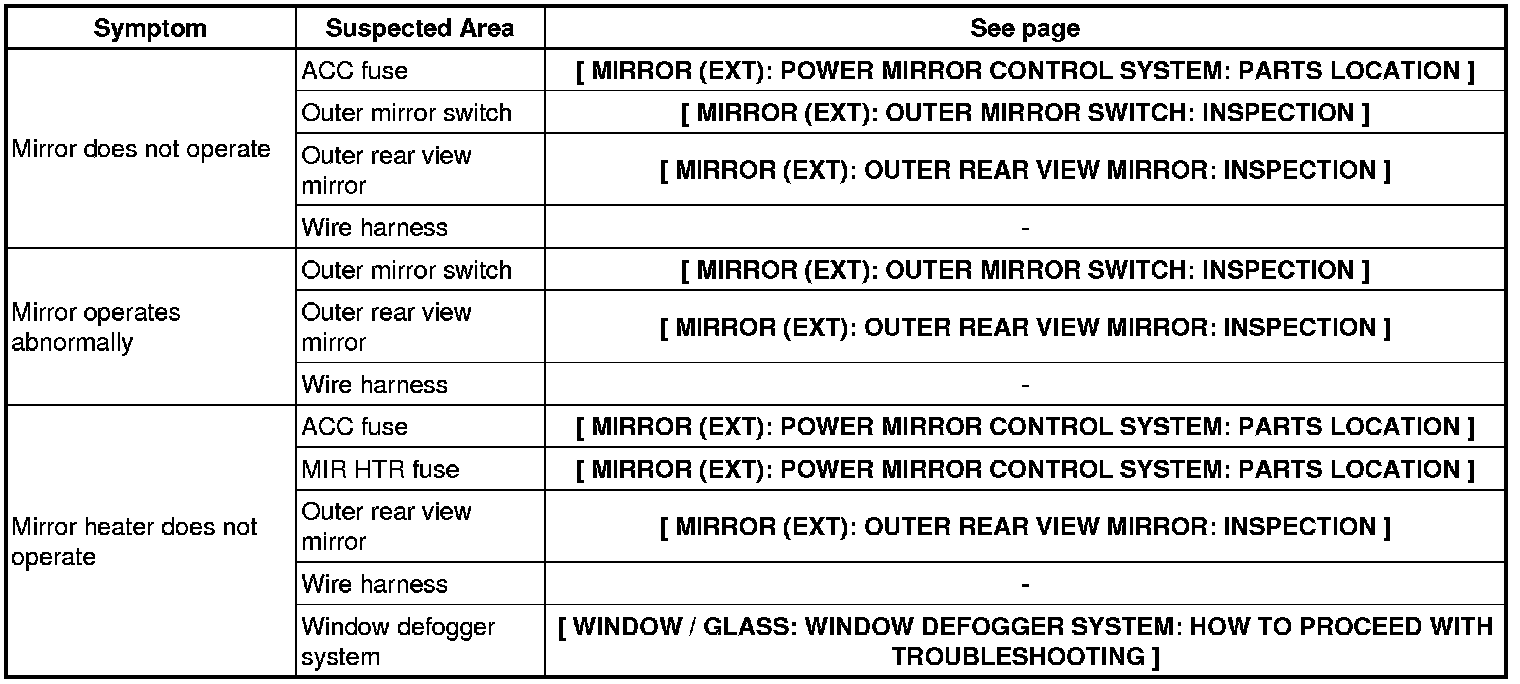 MIRROR (EXT): POWER MIRROR CONTROL SYSTEM: PROBLEM SYMPTOMS TABLE