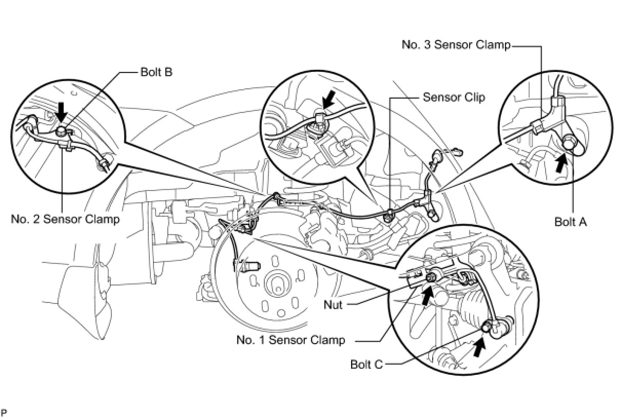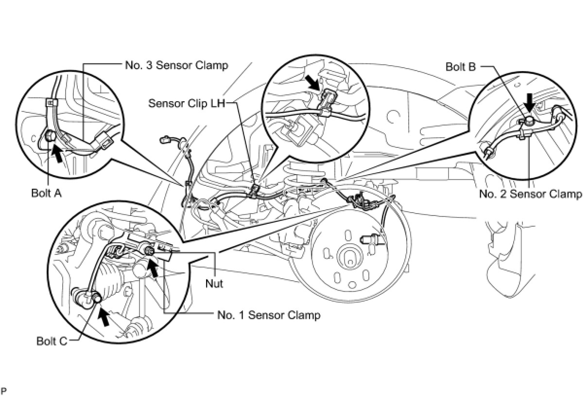 (g) Remove bolt C and rear speed sensor body from the rear axle carrier.