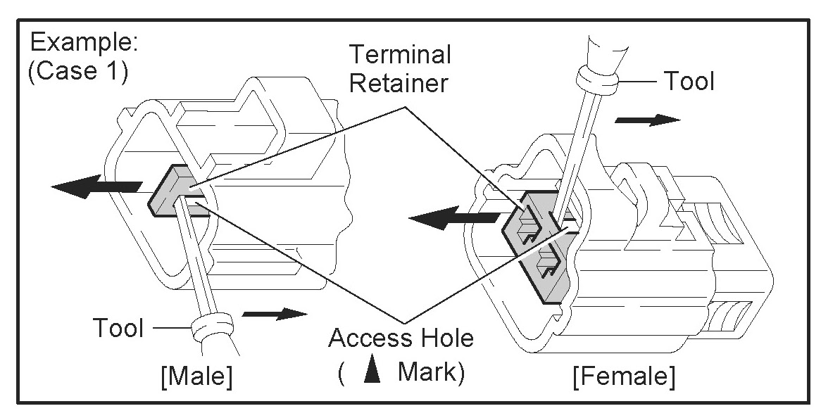 Insert the special tool into the terminal retainer access hole (Triangle Mark) and pull the terminal retainer up to the temporary lock position.