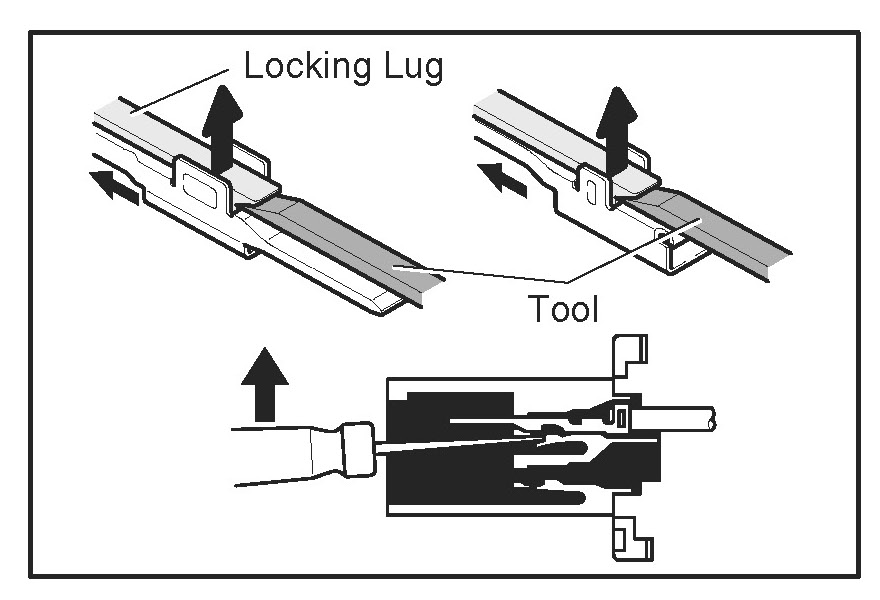a. Locking device must be disengaged before the terminal locking clip can be released and the terminal removed from the connector.
