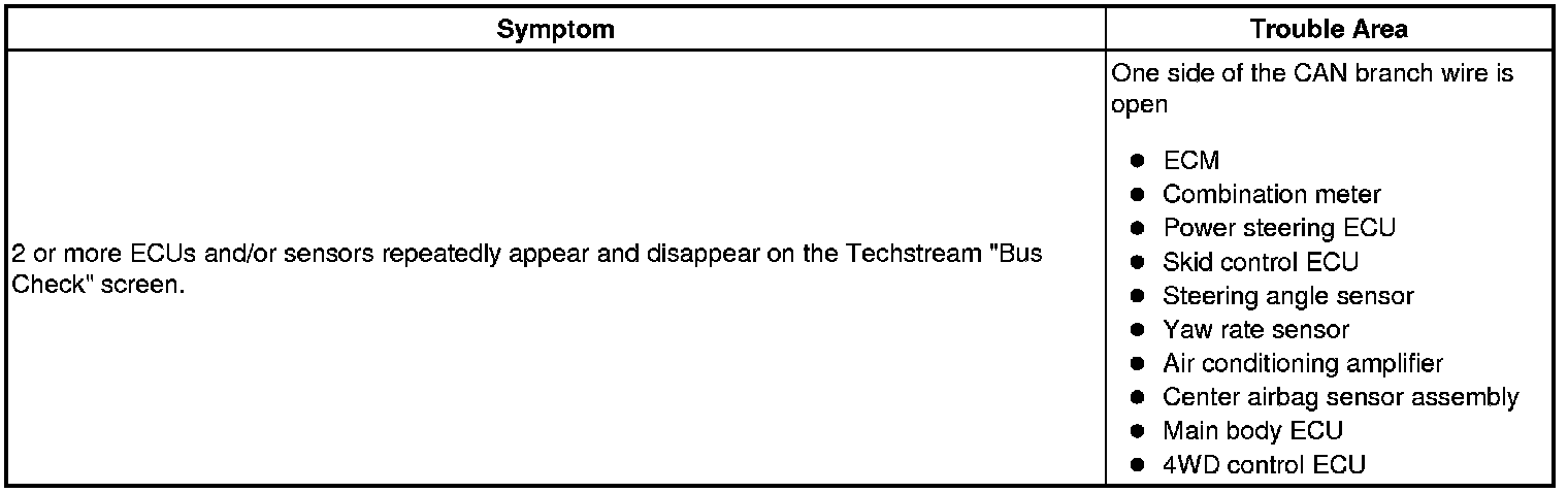 If some ECUs and sensors repeatedly appear and disappear from the "CAN Bus Check" screen, communication between the normal ECUs (sensors) and the Techstream may be affected by the incomplete signals that are output from the ECU that has an open circuit in either of its CAN branch wires. In this case, the CAN branch wires for the ECUs and sensors that repeatedly appear and disappear from the screen are normal and the ECU that is not displayed on the screen may be the main cause of the problem (this ECU may have an open circuit in either of its CAN branch wires).