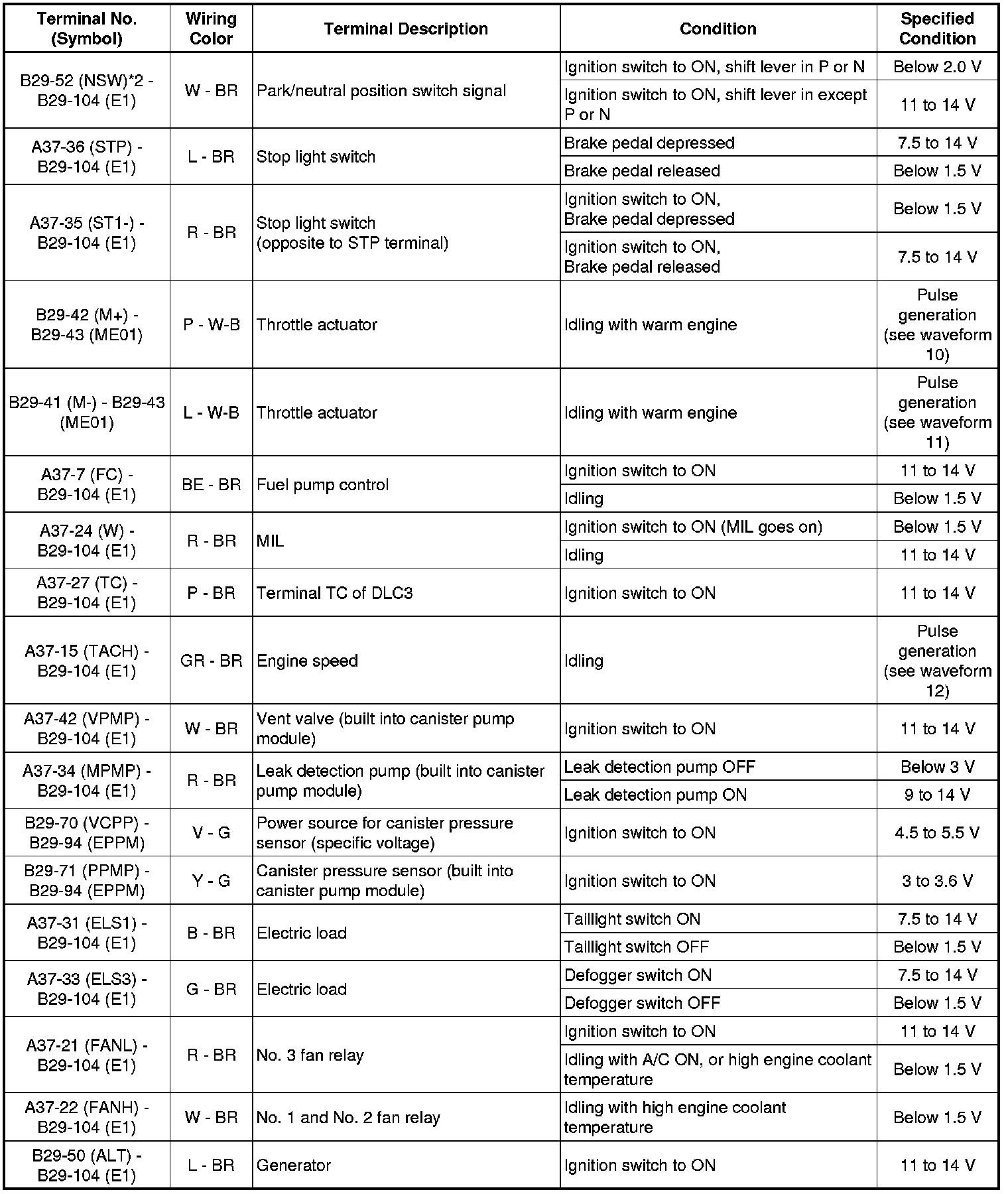 The standard normal voltage between each pair of ECM terminals is shown in the table below. The appropriate conditions for checking each pair of terminals are also indicated. The result of checks should be compared with the standard normal voltage for that pair of terminals, displayed in the Specified Condition column. The illustration above can be used as a reference to identify the ECM terminal locations.