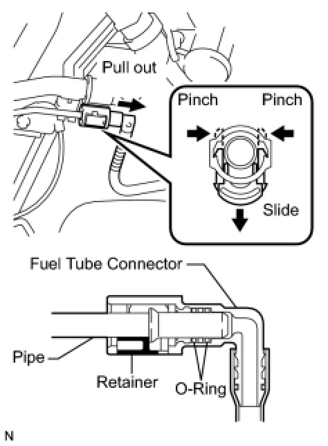 (2) Pinch the retainer of the fuel tube connector, then pull the fuel tube connector out of the pipe.
