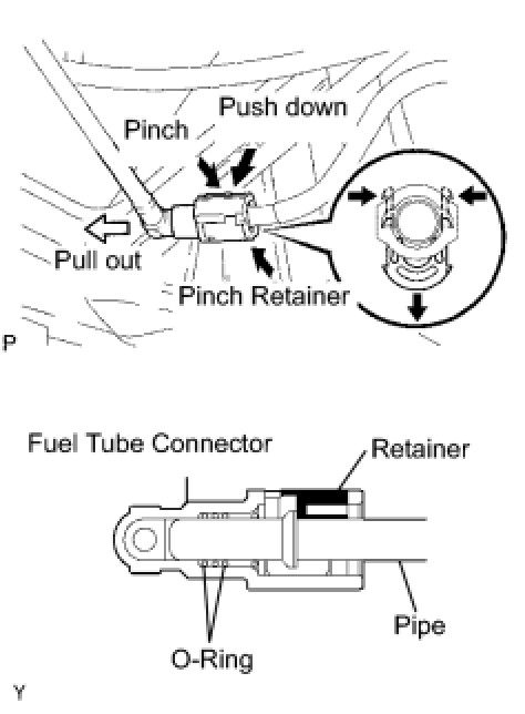 (1) Pinch the tabs of the retainer of the fuel tube connector to disengage the lock claws and push it down as shown in the illustration.