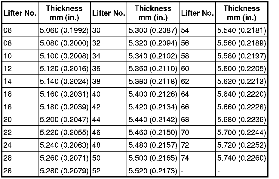 * Lifters are available in 35 sizes in increments of 0.020 mm (0.000787 in.), from 5.060 to 5.740 mm (0.1992 to 0.2260 in.).