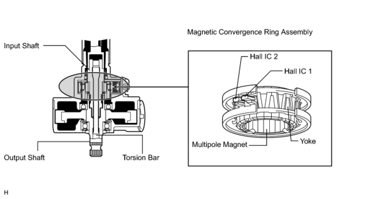 * The power steering torque sensor is built into the steering column. A multipole magnet is mounted to the input shaft, and a yoke is mounted to the output shaft. The input and output shafts are joined by a torsion bar. A magnetic convergence ring assembly is placed outside of the yoke.