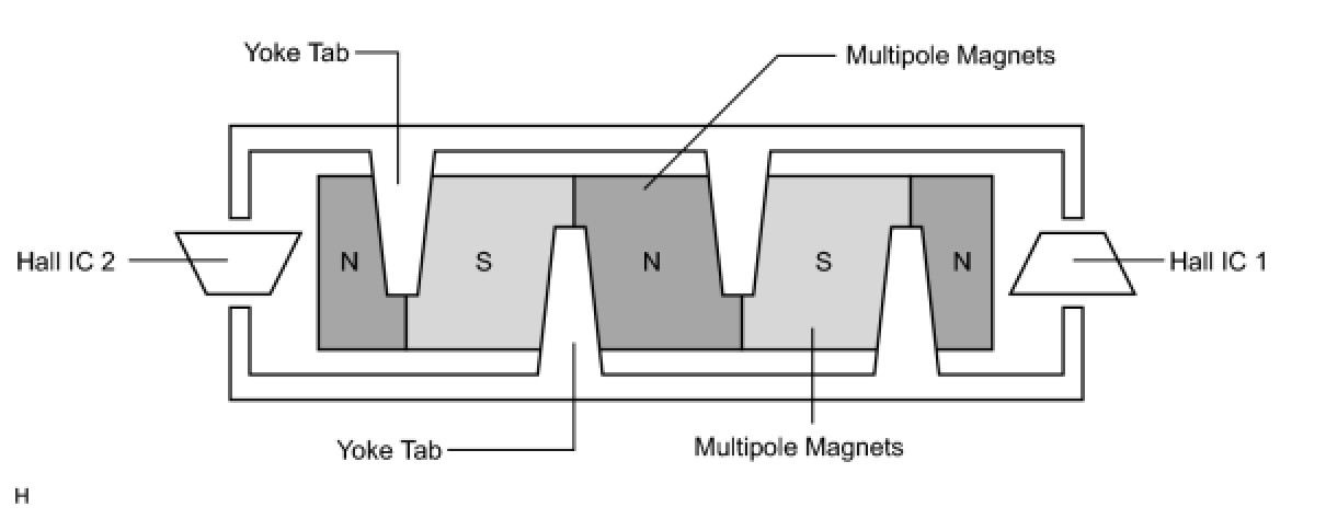* At this time, the magnetic flux from the N to S poles of the multipole magnet passes between the Hall ICs. The system detects the direction the steering wheel being turned in accordance with the direction of the magnetic flux that passes between the Hall ICs. Hall IC1 and Hall IC2 are installed facing opposite to each other. As a result, the output characteristics of the two Hall ICs are constantly opposite each other. The system monitors the different outputs of these Hall ICs in order to detect malfunctions.