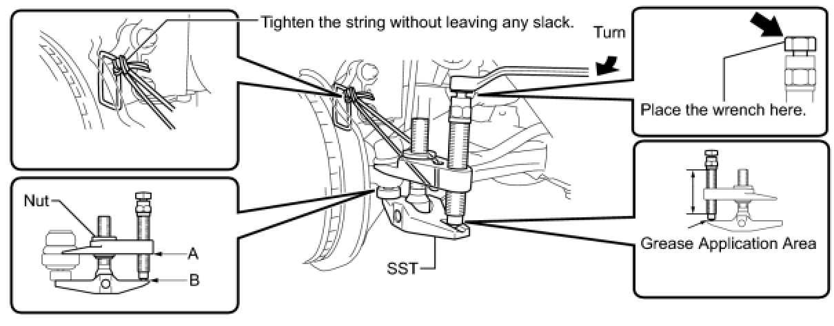 * Be sure to tighten the string firmly to secure SST to the steering knuckle to prevent SST from falling off.