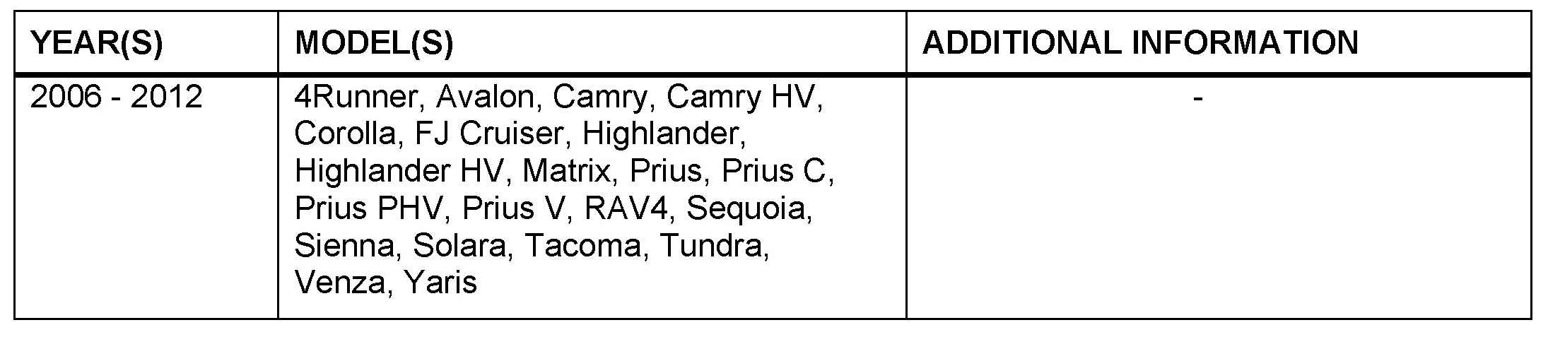 - Applicability has been updated to include 2008 - 2012 model year Toyota vehicles.