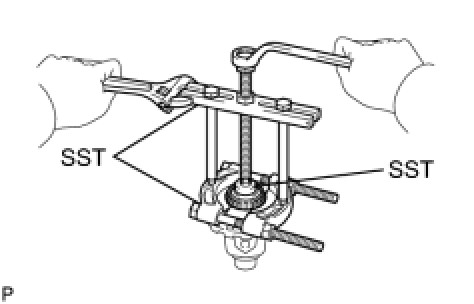 (a) Using SST, remove the front differential case rear tapered roller bearing from the differential case.