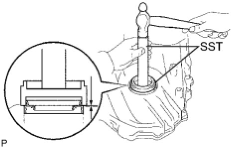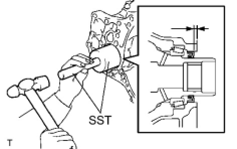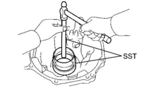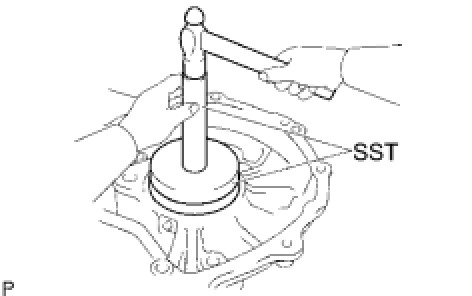 (b) Using SST and a hammer, tap in the front differential case front tapered roller bearing outer race to the transaxle housing.
