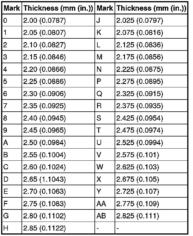 If the preload is not within the specified value, refer to the table below and select an appropriate thrust washer to adjust preload to within the specified value.