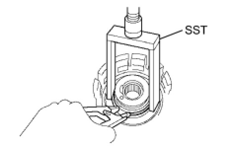 (e) Using SST and a torque wrench, measure the turning torque of the bearing while rotating SST at 60 rpm. If the measured value is not within the specified value, gradually tighten the nut until it reaches the specified value.