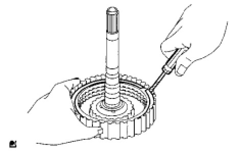 (a) Using a screwdriver, install the front planetary ring gear and snap ring to the brake hub.