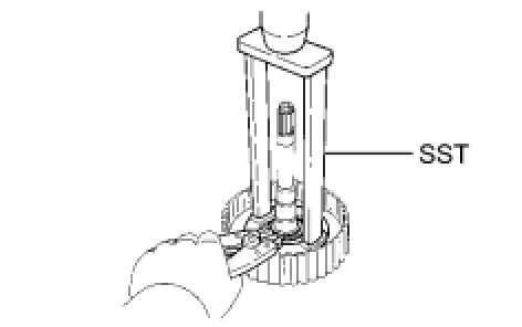 (d) Place SST on the clutch balancer and compress the piston return spring with a press.