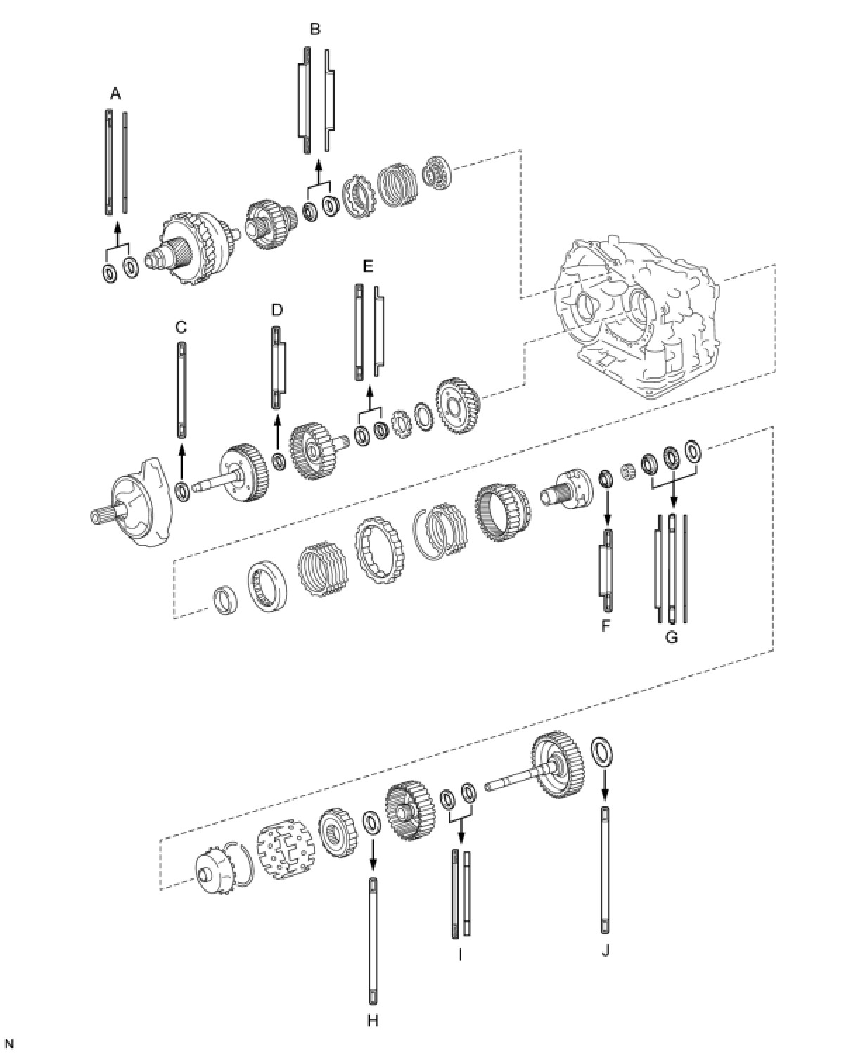 The discs in the direct clutch should be completely mated with the hub attached outside the rear planetary sun gear. Otherwise, the rear cover cannot be installed.