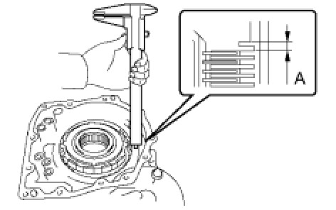 (b) Using a vernier caliper, measure the distance between the disc surface and the contact surface of the 2nd brake cylinder and transaxle (Dimension A).