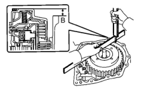 (d) As shown in the illustration, place a straightedge on the direct clutch drum and measure the distance between the transaxle case and the straightedge using a vernier caliper (Dimension B).