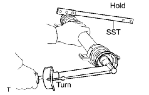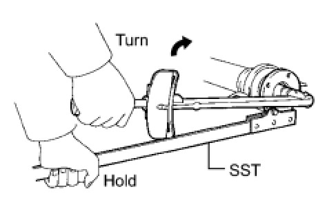 (d) Using SST to hold the universal joint flange, press the No. 1 center support bearing assembly into position by tightening down a new nut and washer.