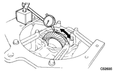 (a) Set a dial indicator perpendicular to a ring gear tooth tip. Secure the driven pinion in place and move the ring gear back and forth to measure the backlash.