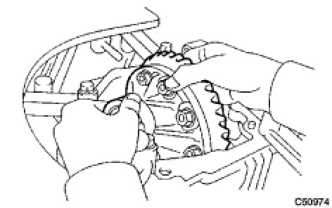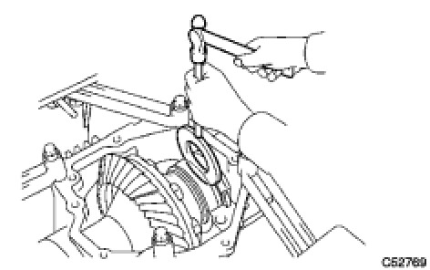 * Even if the tightening torque of the gear nut exceeds the specified torque, if the preload is insufficient, loosen the gear nut once and apply rust preventive oil or hypoid gear oil to the gear nut and to the screw or bearing surface of the driven pinion. Then perform the procedure again. If the tightening torque is less than the specified torque, replace the pinon bearing spacer with a new one and adjust it.