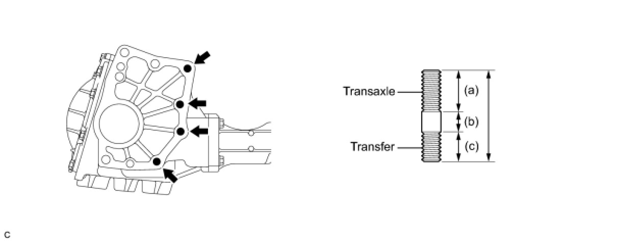 (a) Install the 4 transfer and transaxle setting stud bolts to the transfer case positions shown in the illustration.