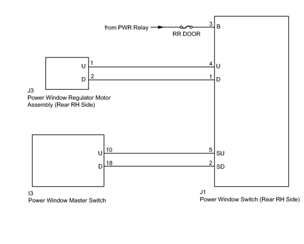 If the rear RH side manual UP / DOWN function does not operate, a malfunction may exist in the power window regulator motor, power window switch, power window master switch or wire harness.