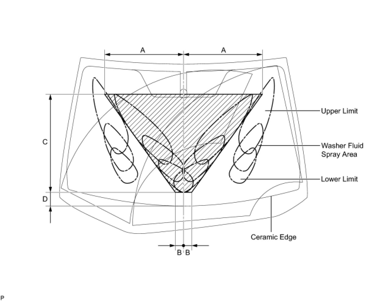 Washer fluid hits the windshield in the areas shown in the illustration.