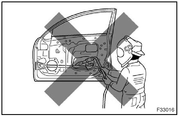 1. Rustproof high strength steel sheets are used for the body frame. Therefore, if these parts are heat repaired using an acetylene torch or equivalent, the crystalline structure changes, causing the strength of the steel sheets to decrease. Also, the zinc coating which is used to protect the body from rust will be damaged. This causes the surface of the steel sheets to become oxidized, which reduces their ability to resist rust.