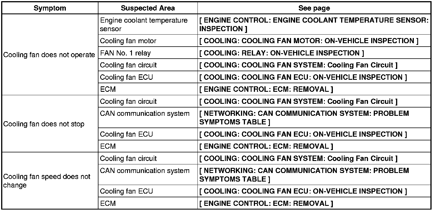 2ZR-FE COOLING: COOLING FAN SYSTEM: PROBLEM SYMPTOMS TABLE