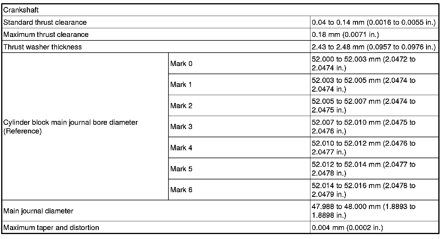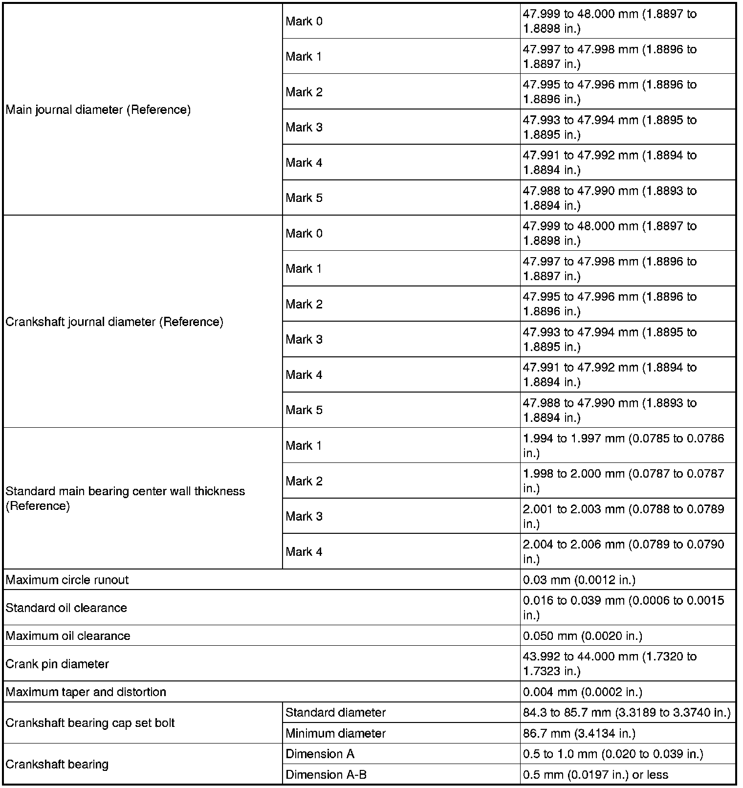 Crankshaft Main Bearing: Specifications