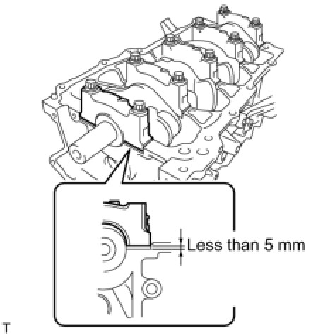 (f) Insert the main bearing cap by hand until the clearance between the main bearing cap and the cylinder block is less than 5 mm (0.20 in.) using the 2 internal bearing cap bolts as guides.
