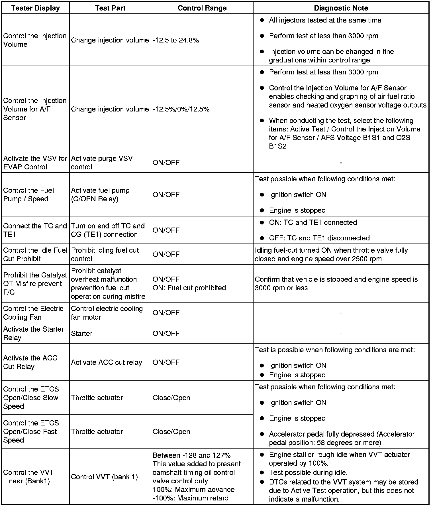 Using the Techstream to perform the Active Tests allows relays, VSVs, actuators and other items to be operated without removing any parts. This non-intrusive functional inspection can be very useful because intermittent operation may be discovered before parts or wiring is disturbed. Performing Active Tests early in troubleshooting is one way to save diagnostic time. Data List information can be displayed while performing Active Tests.