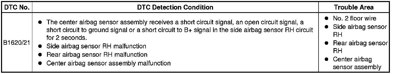 DTC B1620/21 is recorded when a malfunction is detected in the side airbag sensor RH circuit.
