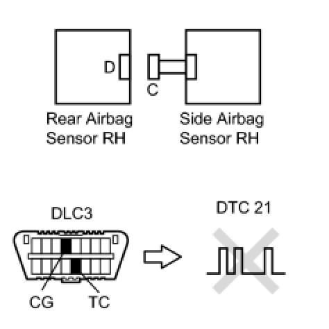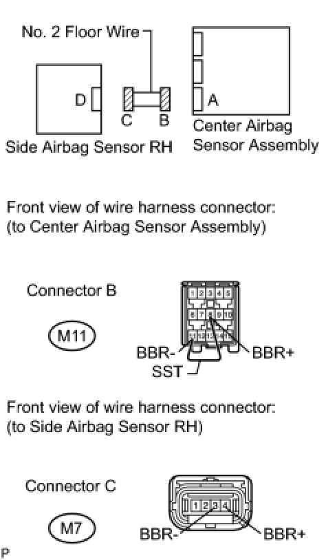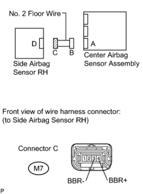 The side airbag sensor RH circuit consists of the center airbag sensor assembly, side airbag sensor RH and rear airbag sensor RH.