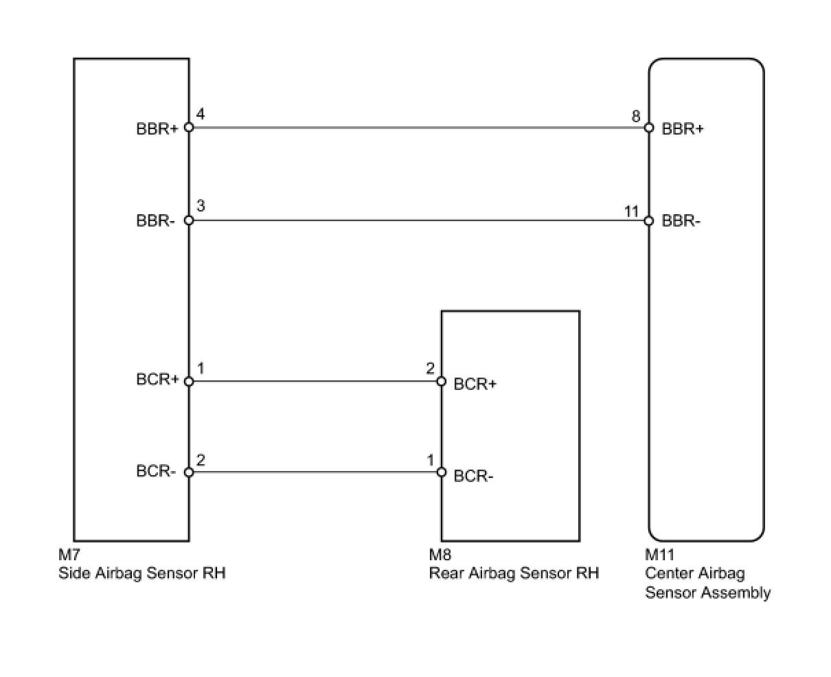 The rear airbag sensor RH circuit consists of the center airbag sensor assembly, rear airbag sensor RH, and side airbag sensor RH.