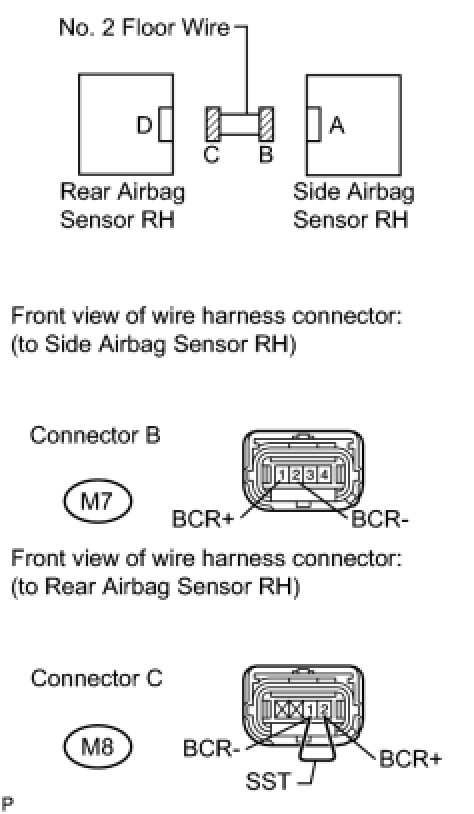 (c) Check that the connectors are properly connected to the side airbag sensor RH and the rear airbag sensor RH.