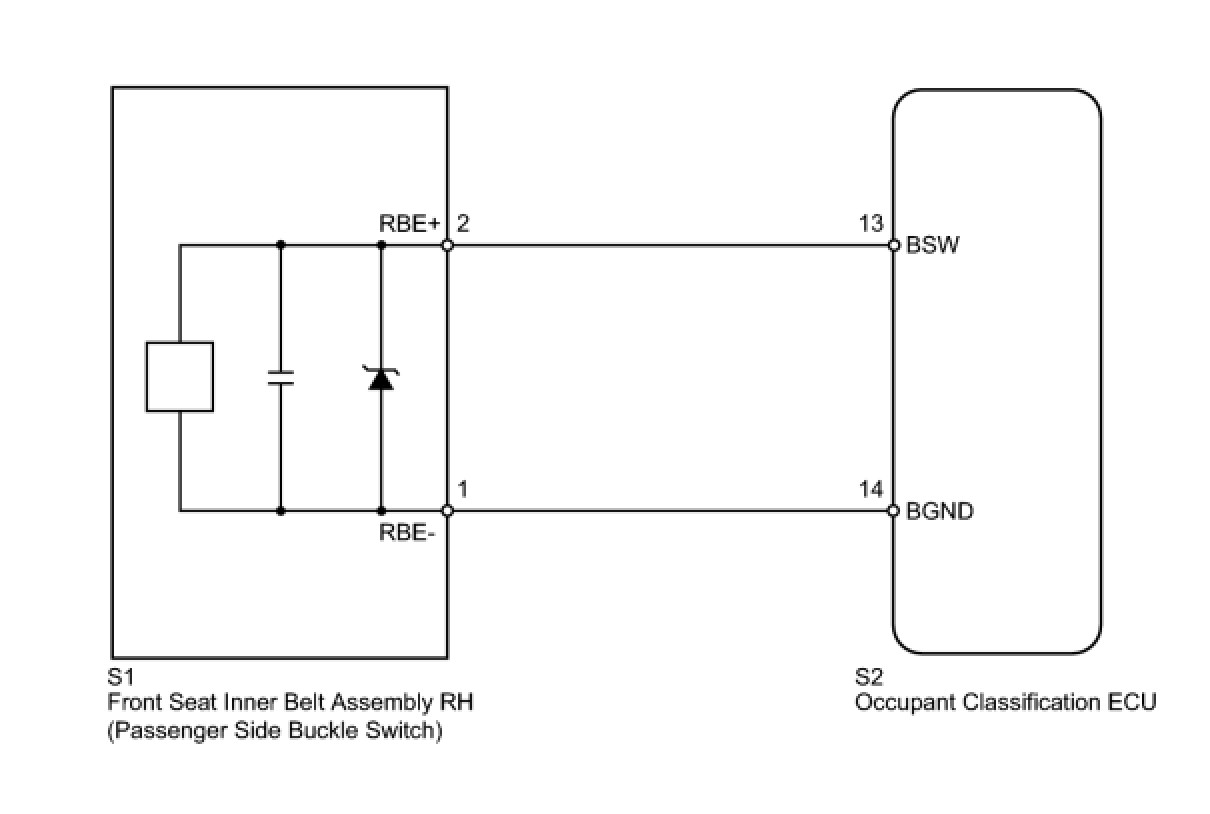 The passenger side buckle switch circuit consists of the occupant classification ECU and the front seat inner belt assembly RH.