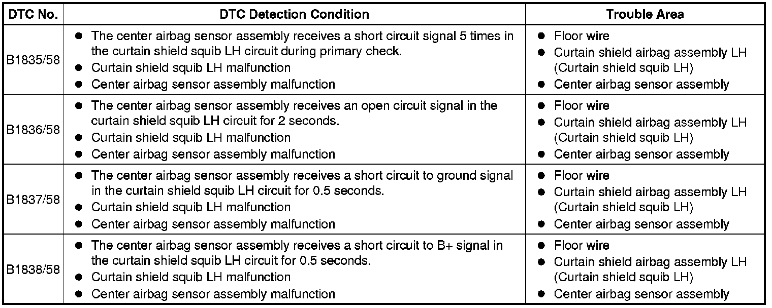 These DTCs are recorded when a malfunction is detected in the curtain shield squib LH circuit.