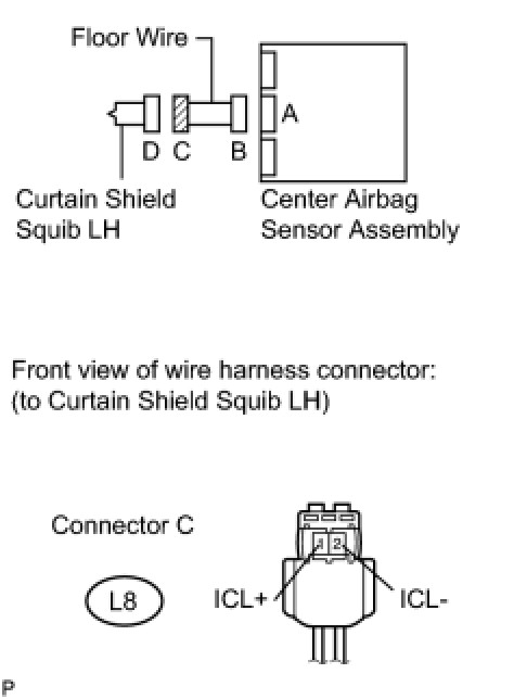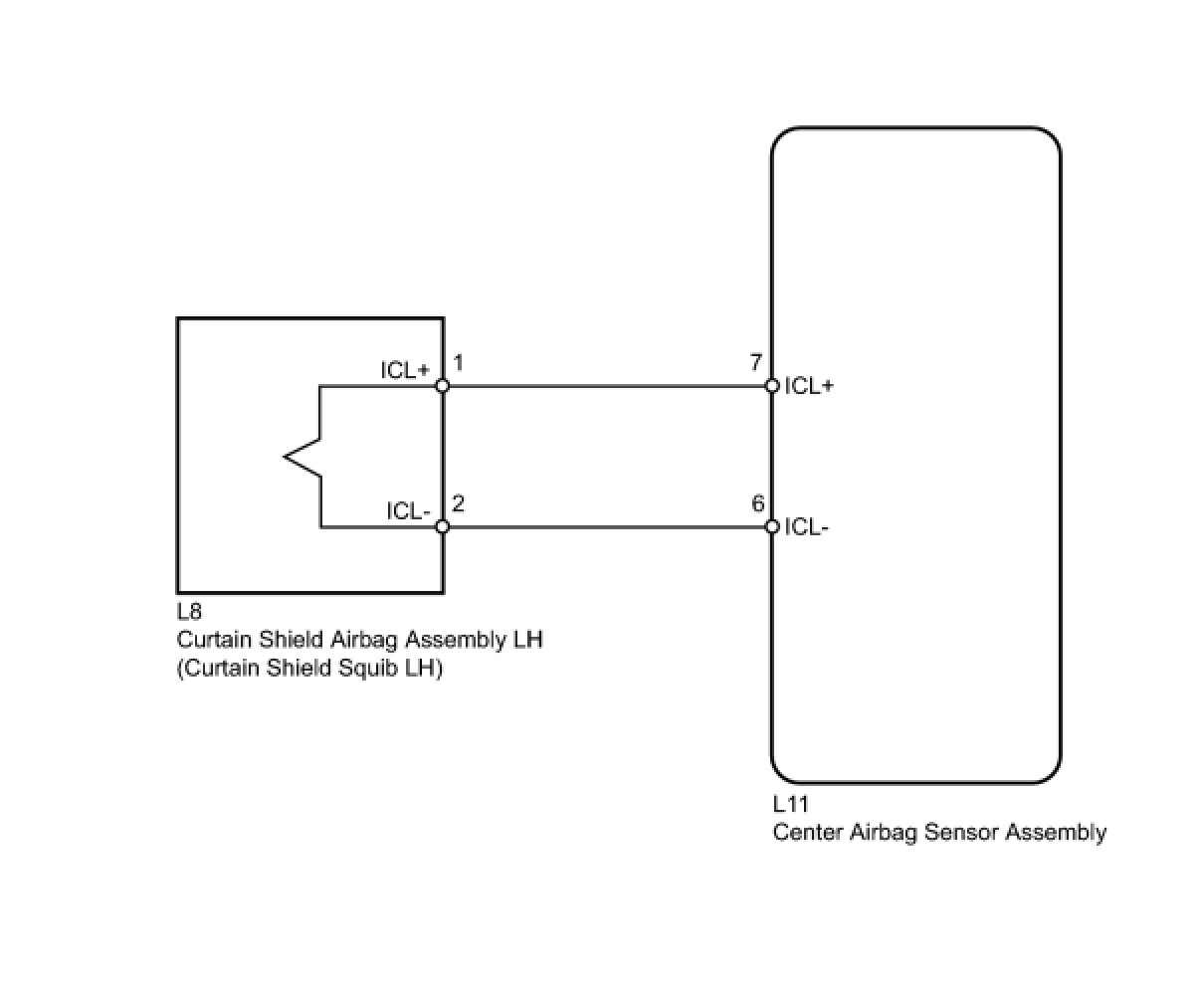 The curtain shield squib LH circuit consists of the center airbag sensor assembly and the curtain shield airbag assembly LH.