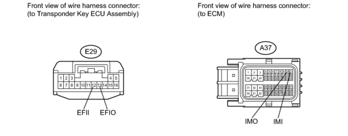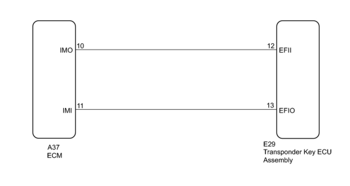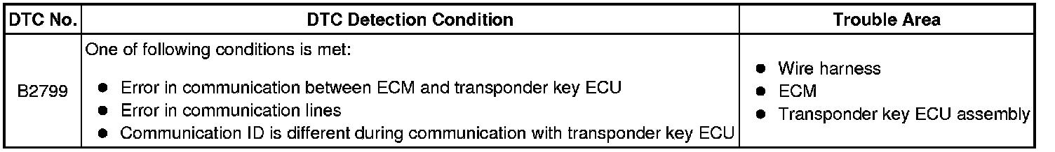 This DTC is output when one of the following occurs: 1) the ECM detects errors in its own communications with the transponder key ECU; 2) the ECM detects errors in the communication lines; or 3) the ECU communication ID between the transponder key ECU and ECM is different and an engine start is attempted. Before troubleshooting for this DTC, make sure no transponder key ECU DTCs are present. If present, troubleshoot the transponder key ECU DTCs first.