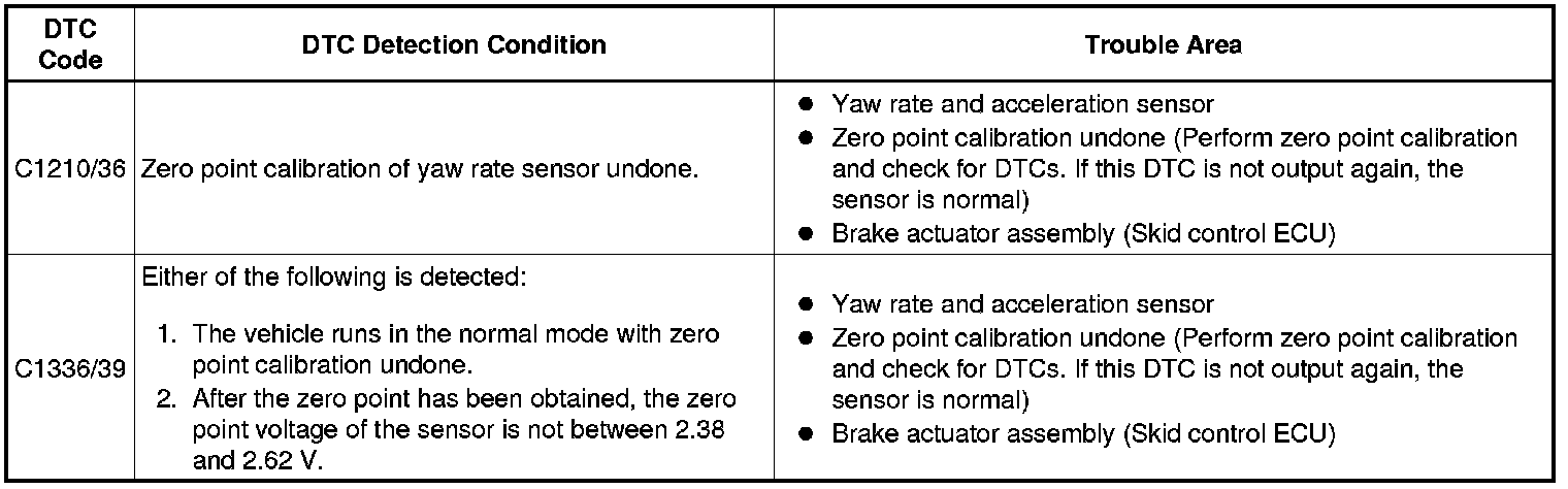 BRAKE CONTROL / DYNAMIC CONTROL SYSTEMS: VEHICLE STABILITY CONTROL SYSTEM (for 2AZ-FE): C1210/36, C1336/39: Zero Point Calibration of Yaw Rate Sensor Undone