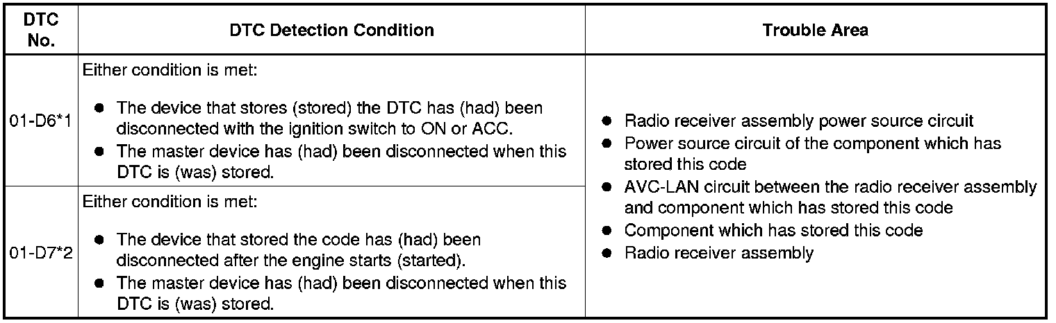 * *2: When 210 seconds have elapsed after disconnecting the power supply connector of the master component with the ignition switch to ON or ACC, this DTC is stored.