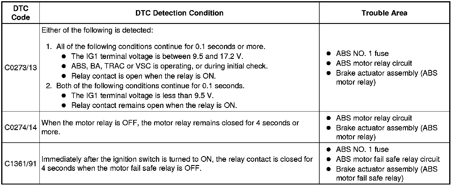 BRAKE CONTROL / DYNAMIC CONTROL SYSTEMS: VEHICLE STABILITY CONTROL SYSTEM (for 2AZ-FE): C0273/13, C0274/14, C1361/91: Open in ABS Motor Relay Circuit