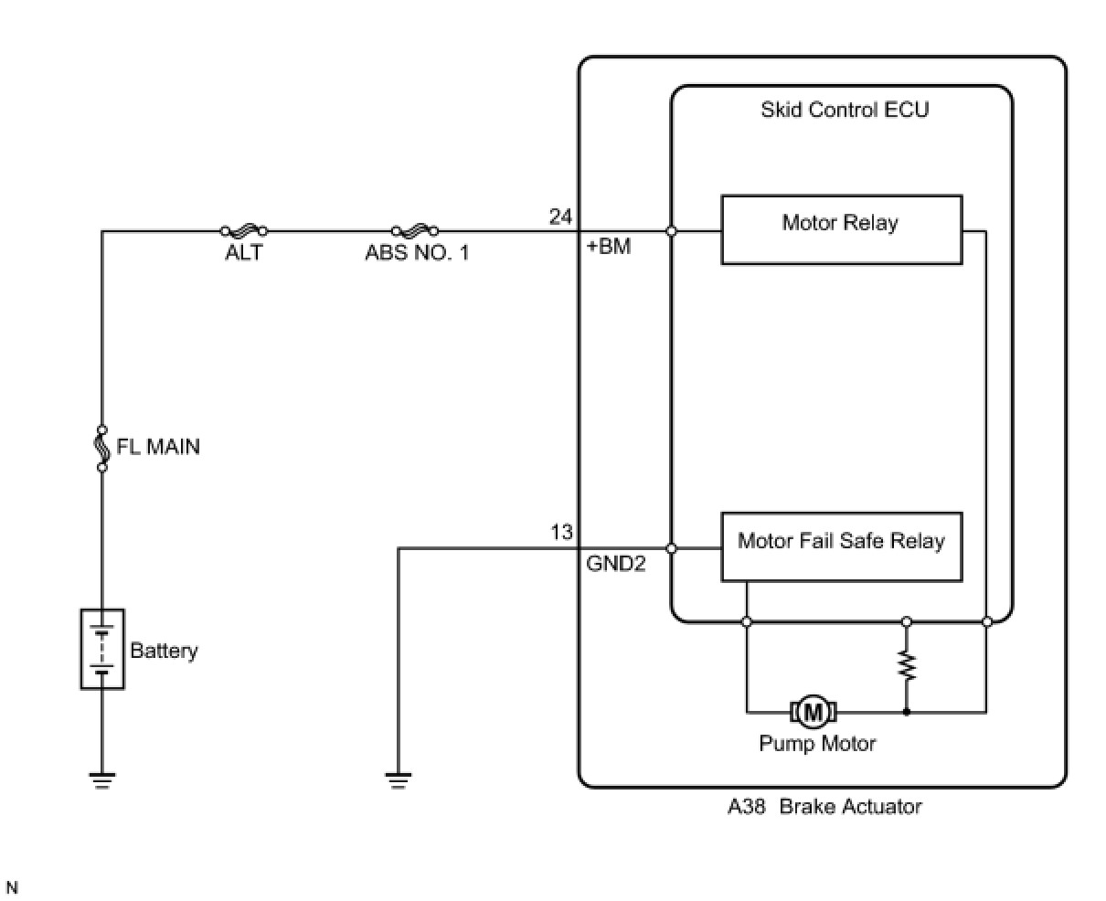 The ABS motor relay supplies power to the ABS pump motor. While the ABS is activated, the ECU turns the motor relay on and operates the ABS pump motor.