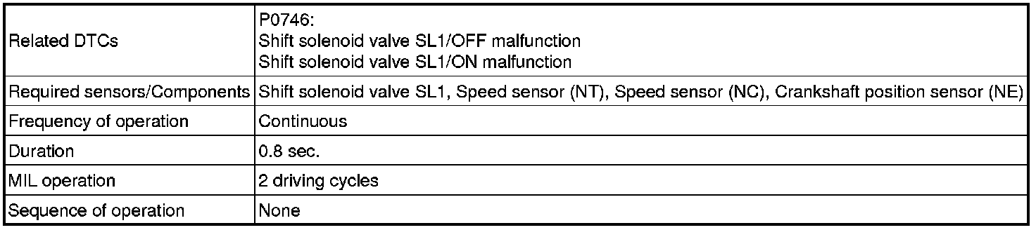 U250E AUTOMATIC TRANSMISSION / TRANSAXLE: AUTOMATIC TRANSAXLE SYSTEM: P0746: Pressure Control Solenoid "A" Performance (Shift Solenoid Valve SL1)