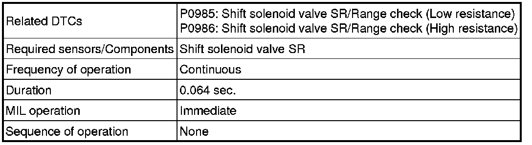 U250E AUTOMATIC TRANSMISSION / TRANSAXLE: AUTOMATIC TRANSAXLE SYSTEM: P0985, P0986: Shift Solenoid "E" Control Circuit Low (Shift Solenoid Valve SR)