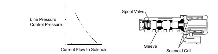 Shift solenoid valve SLT controls the transmission line pressure for smooth transmission operation based on signals from the throttle position sensor and vehicle speed sensor. The ECM adjusts the current to shift solenoid valve SLT to control the hydraulic line pressure coming from the primary regulator valve. Appropriate line pressure assures smooth shifting with varying engine outputs.