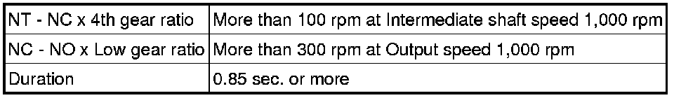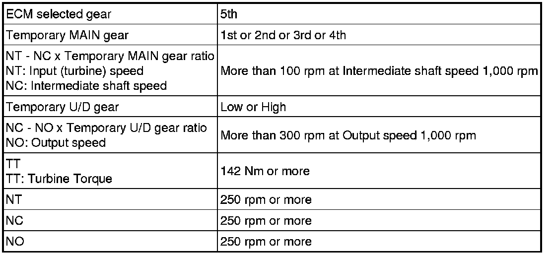 In any forward position, when the difference in the revolutions of the turbine, intermediate and output shaft exceeds the specified value (varies with intermediate and output speed) determined by the ECM, the ECM illuminates the MIL and stores the DTC.