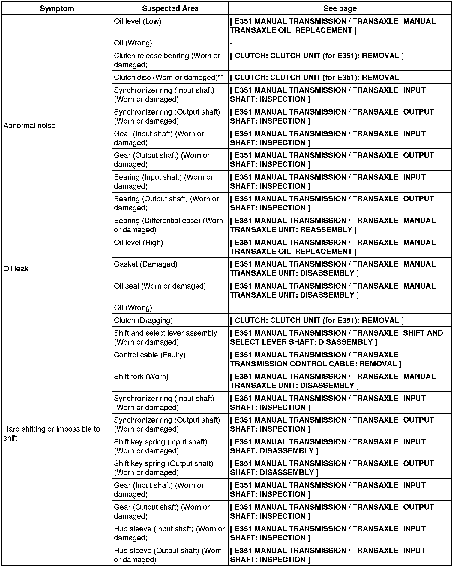 E351 MANUAL TRANSMISSION / TRANSAXLE: MANUAL TRANSAXLE SYSTEM: PROBLEM SYMPTOMS TABLE